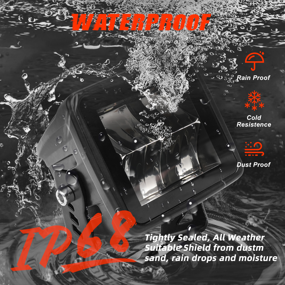 IP68-rated housing with a tough die-cast aluminium body and shatter-resistant lens stands up to mud, water, and impact. -